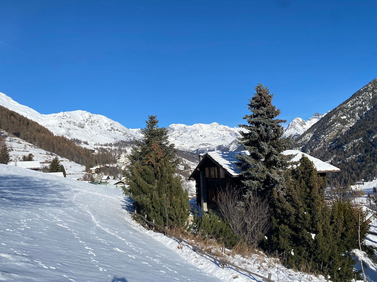 Alperne. Italien. Aostadalen. En hytte i en lille landsby på 1600 meter i fred i enge, græssende køer og bjerge. Sne (som regel) om vinteren. Et sted af hjertet, kærligt restaureret og bevarer de gamle bjælker på taget. En vidunderlig udsigt fra de store vinduer og en særlig ro for dem, der søger fred, varme og afslapning. Møblerne er meget fine: frem for alt træ, men også mere livlige farver og moderne bekvemmeligheder. Rolige udflugter, både på snesko eller på ski.