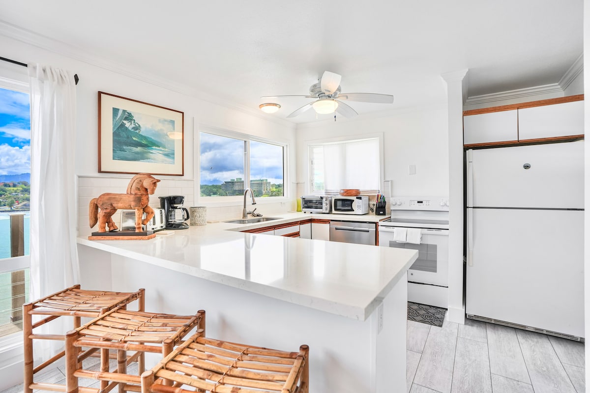Centralt beliggende og nyrenoveret lejlighed med 2 soveværelser, 2 badeværelser få minutter fra lufthavnen og gåafstand til restauranter og barer. Med to queensize-senge og to dobbeltsenge vil hele din familie nyde at se krydstogtskibe fra en af de tre lanaier. Tag de medfølgende strandstole, og gå over til Kalapaki Beach for at få en varm sol, eller hop i bilen, og tag ud på eventyr. Beliggende i Lihue, er alle dele af smukke Kauai ikke mere end en nem dagstur!