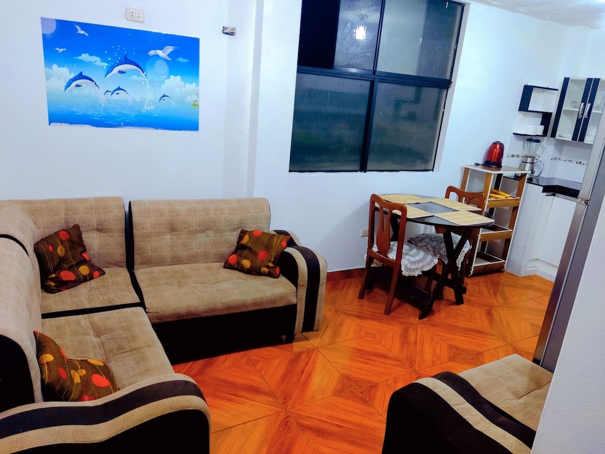 Et sted, hvor du kan slappe af med alle bekvemmeligheder, så du føler dig hjemme. Er du på gennemrejse i Lima, og venter på dit næste fly? Så er dette det perfekte sted! Meget tæt på Jorge Chávez Internationale Lufthavn. Lejligheden har: 1 køjeseng med en queensize seng og en enkelt seng Varmt vand Køleskab med fryser, vaskemaskine, ovn, køkken, mikrobølgeovn, køkkengrej, bestik. Super internet Wifi MASWINNER 500 Mbps kapacitet. Soveværelse med aircondition.