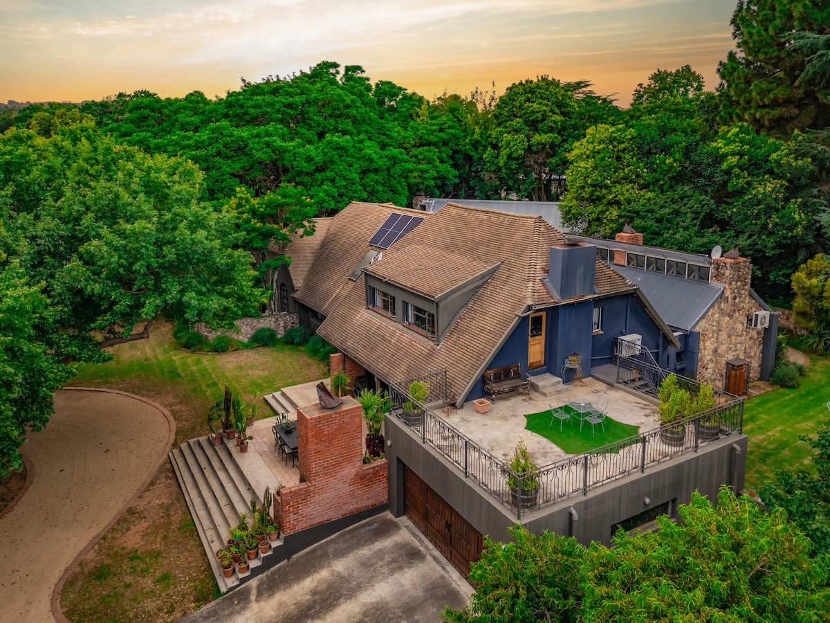 Familiehaveoase, madparadis, fjernarbejde Privat og sikker forstad nær Sandton. Privat terrasse og opvarmet pool. Strøm 24/7 Træning, løvfyldte omgivelser, fuglekigning Superhurtig ubegrænset wi-fi Maks. 6 gæster 1 kingsize-seng - soveværelse 1 Inc en-suite jacuzzi bad 1 queensize-dobbeltseng 2 2 singler generelt for børn (1 mobil 1 i lounge) Nyfødt barneseng, bad, høj stol osv. Aircondition i soveværelser Netflix/Amazon Prime Bevæbnet svar 🚓 Ejernes hytte på ejendommen