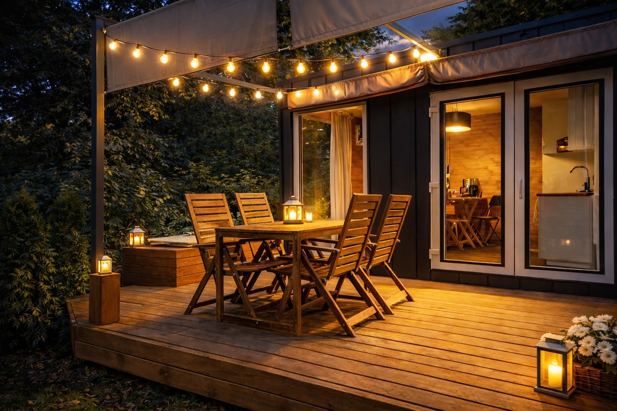 Domek z balią nad Wisłą – idealny na spokojny wyjazd we dwoje lub reset w naturze. Do dyspozycji gości jest prywatny taras z pergolą, drewnianym stołem i leżakami, a także wbudowana balia, przygotowywana na życzenie – idealna na wieczorny odpoczynek przy świecach i lampkach wina. Domek otacza zielony ogródek z miejscem na ognisko i grill, dzięki czemu można w pełni poczuć klimat wypoczynku nad Wisłą. To świetne miejsce zarówno na romantyczny wyjazd, jak i spokojny reset z dala od miasta.