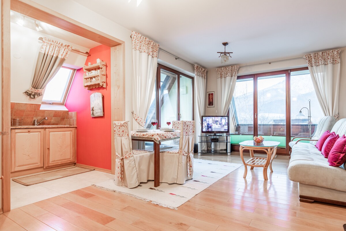Denne smukke lejlighed ligger i et malerisk område med udsigt over Tatra-bjergene. Den er fuldt udstyret og tilbyder komfort og bekvemmelighed under dit ophold. Hovedelementet i lejligheden er en rummelig stue, som er et ideelt sted at slappe af. Den tilstødende terrasse til stuen giver udsigt over de majestætiske Tatra-bjerge, hvor du kan nyde den friske luft og udsigten over bjergtoppene.