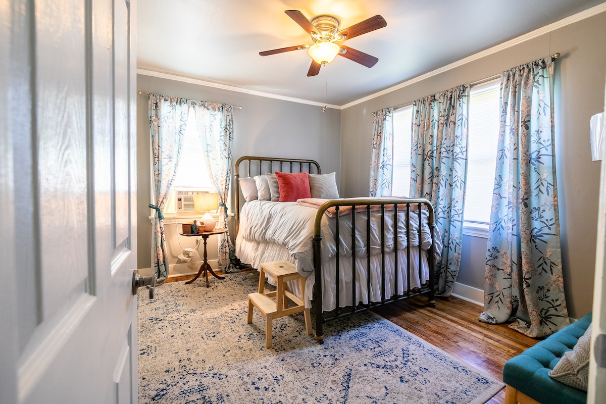 Clementines værelse er et dejligt gemmested i Mid City på Bayou St. John. Det er simpelthen et soveværelse/bad med flisebruser, vaskemaskine/tørretumbler og kingsize-seng. Døren er ved siden af et lysthus til udendørs tid, og skrivebordet kan arrangeres, så 2 kan spise indenfor. Der er et stort Roku-tv til streaming af shows, et minikøleskab, mikrobølgeovn, elkedel og kaffetragt til at lave morgenkaffe eller te, og tallerkener og bestik til opvarmning af en snack. Den kan også kombineres med vores Sweet Suite til 2 soveværelser/2 badeværelser familiebooking