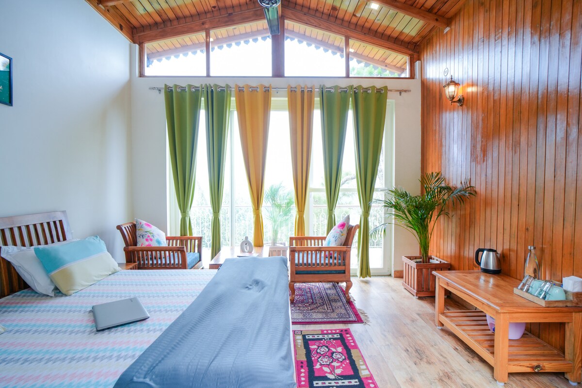 Named after their beloved pet, Cujo’s Haus is the kind of place that wraps around you like your favourite blanket on a cold mountain day. A feeling of warmth, calm, and quiet joy that gently settles in the moment you arrive. With four thoughtfully designed cottages, two spacious 2BHKs and two cosy 1BHKs, this hillside retreat blends white and wood interiors with cheerful pops of colour and centrally floor-heated comfort.