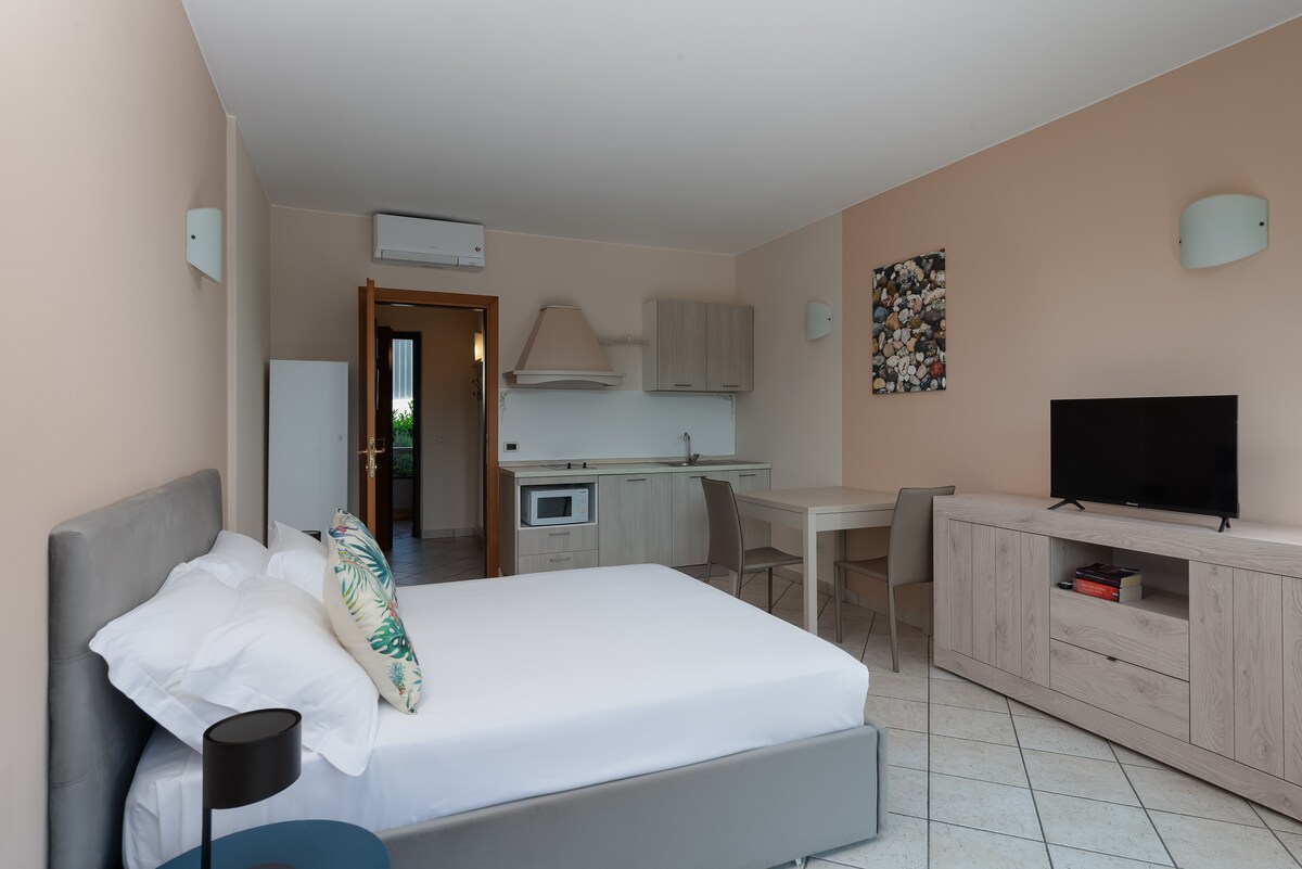 Studielejligheden med udsigt over haven i Desenzano del Garda med en stor balkon og privat garage måler 35 kvadratmeter og har plads til 2 personer. Den er rummelig og hyggelig og ligger på første eller anden sal. Lejligheden har soveværelse og badetøj, badeværelseslinje, hjemmesko, komplet køkkenudstyr med mikrobølgeovn og kedel, aircondition – varme, pengeskab, wi-fi internetforbindelse, telefon og parkeringsplads i garagen.