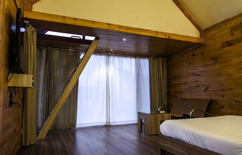 En hyggelig skovhytte på 220 kvadratfod, 12 fod høj, med udsigt til den omkringliggende tætte skov. Har et veludstyret toilet og bruser og en privat balkon, der giver gæsterne mulighed for at nyde naturens skønhed og tilbyder en fredfyldt oase blandt træerne.