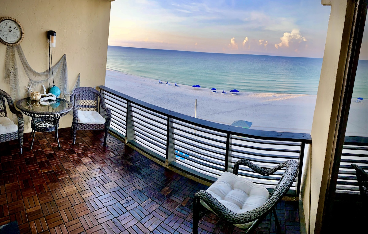 Emerald Villa! Direkte strandfront og hundevenlig! 2 strandstole med parasol 15/3-31/10. Opgraderet lejlighed med udsigt over smuk pool og stranden! Fantastisk udsigt over bugten! Smukke slidte træplankfliser, nyt køkken med kvartsborde, flisebelagt walk-in-bruser, 2 HDTV'er, Novilla memory foam-madras og kystindretning. Queen sovesofa med opgraderet madras. Gå til Pier Park, Top Golf! Gulf World og hundestrand! 5 minutter til Frank Brown Park. Vi ejer 3 tilstødende enheder, herunder en enhed på 1. sal!
