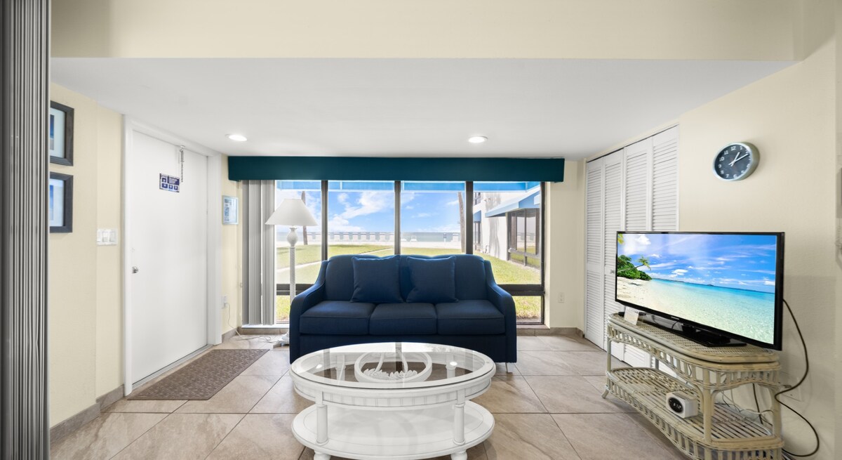 Nyrenoveret (november 2025) moderne lejlighed på første sal bogstaveligt talt fem skridt fra sandet, når man går ud fra lanai. Et soveværelse/et badeværelse Kingsize-dobbeltseng i primær Sovesofa med queensize-dobbeltseng i stuen Indgang med nøglekode Gratis parkering Opvarmet swimmingpool på stedet Gratis strandstole på stranden Betalte vaskemaskiner på stedet Mid Island ved siden af alt Wi-fi, kabel, gratis parkering Normalt mindst 7 nætter Medbring din tandbørste og badetøj, og gør dig klar til at slappe af!!!!