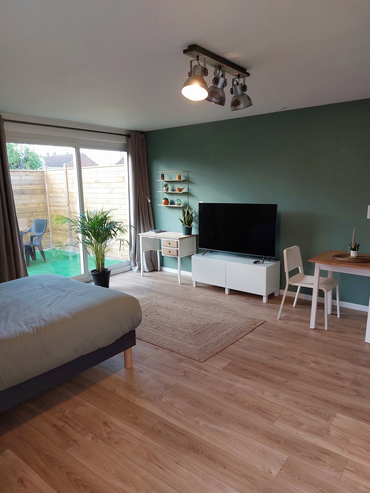 35 m2 studie, beliggende i bunden af vores have, hvor der er ro og afslapning (uden nogen overfor). Lille havehjørne. Studiet er moderne og varmt. Her finder du et hovedrum med køkkenkrog, udstyret med kaffemaskine, gasplade, mikrobølgeovn, køleskab, kontorområde, sofa. Et soveområde med en dobbeltseng Et badeværelse. Sengetøj til rådighed. Parkeringsplads udenfor. Les + A2 nær Amiens centrum og et indkøbscenter.