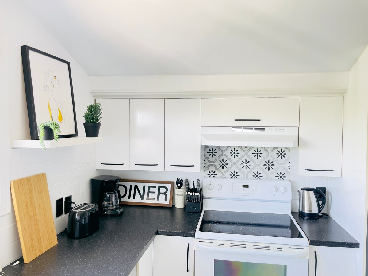 🛏️ Sov som en drøm – blød queensize-seng med sengetøj af hotelkvalitet. Få ro i sindet, efter du har udforsket Montreal. 📺 Netflix og chill – Smart-tv med streaming-apps. 🚿 Moderne og pletfrit badeværelse – 🍳 Fuldt udstyret køkken – Spar penge på at spise ude. Lav mad som en professionel med alle fornødenheder. 🚗 SJÆLDENT FUND: GRATIS parkering! – Parkér GRATIS. 🚀 Arbejde og leg – højhastigheds-WiFi + dedikeret arbejdsområde til digitale nomader. ✅ 14 minutter til downtown Montreal – perfekt til koncerter, festivaler, natteliv.