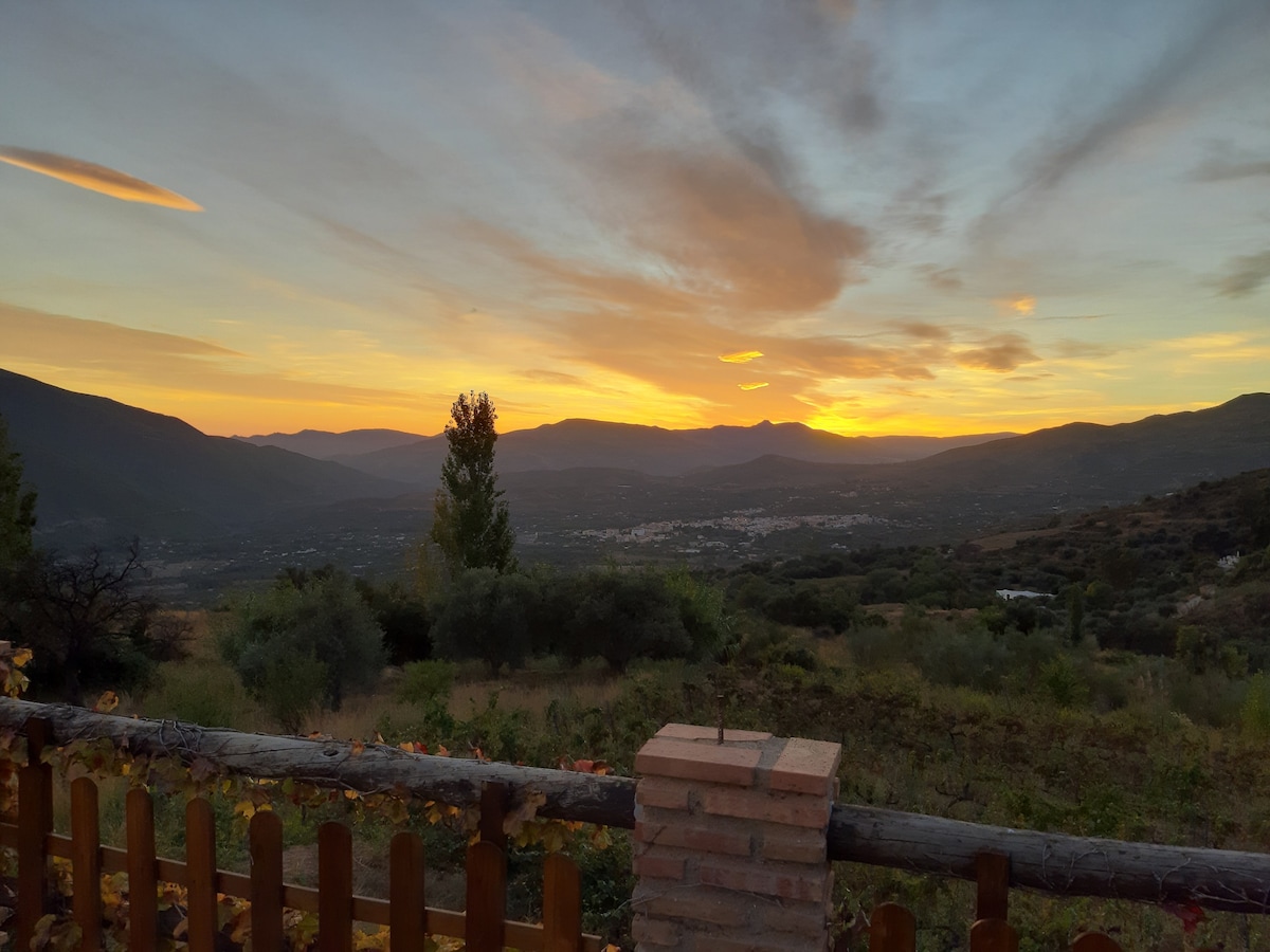 Et smukt, moderniseret hus i en dal omgivet af bjerge, der ligger i en hektar jord med privat swimmingpool. Parkering, sikkert hegn omkring ejendommen. To soveværelser, badeværelse og brusebad, brændeovn. Lounge og køkken i åben planløsning. Tagterrasse med bjergudsigt. Helt privat. Frugtræer, oliventræer, plantager og vinstokke, lidt frugt. Roligt område, lokal husholderske, der byder dig velkommen. En halv time fra den nærmeste strand, en time fra Granada.