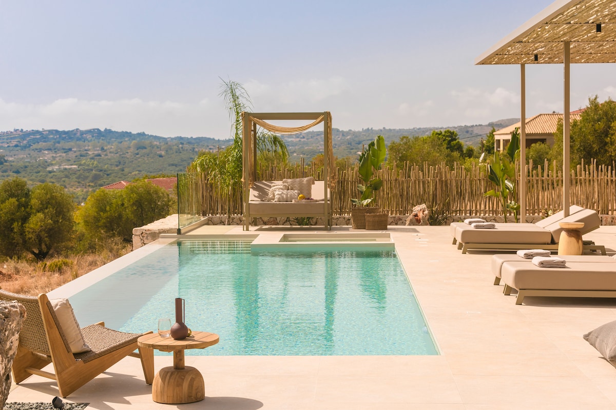 Et nybygget hus åbner sine døre i år for første gang for at byde selv de mest krævende gæster velkommen. Villaens privatliv og arkitekturen, der matcher det moderne med den minimale dekoration, i kombination med de komfortable rum og den imponerende facade med udsigt over det uendelige blå i Det Ioniske Hav, gør det til et hyggeligt og fortryllende sted. Nyd dit ophold i denne afslappende og elegante bolig!