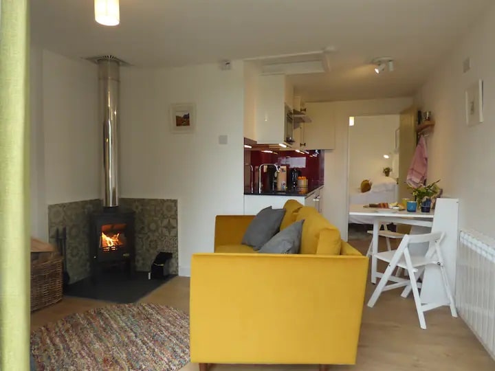 Fjerntliggende, 2-etagers, selvstændig hytte med stor, åben tredobbelt stue på 1. sal med fantastisk udsigt. Nedenunder er der et soveværelse med kingsize-seng, brusebad og køkken/spisestue med brændeovn, spisebord og to komfortable stole med udsigt over det omfattende landskab. Franske døre åbner ud til en terrasse med havemøbler og chimenea og et privat haveområde med grill. Fremragende wi-fi-signal overalt. Velopdragne hunde er velkomne - maks. 2