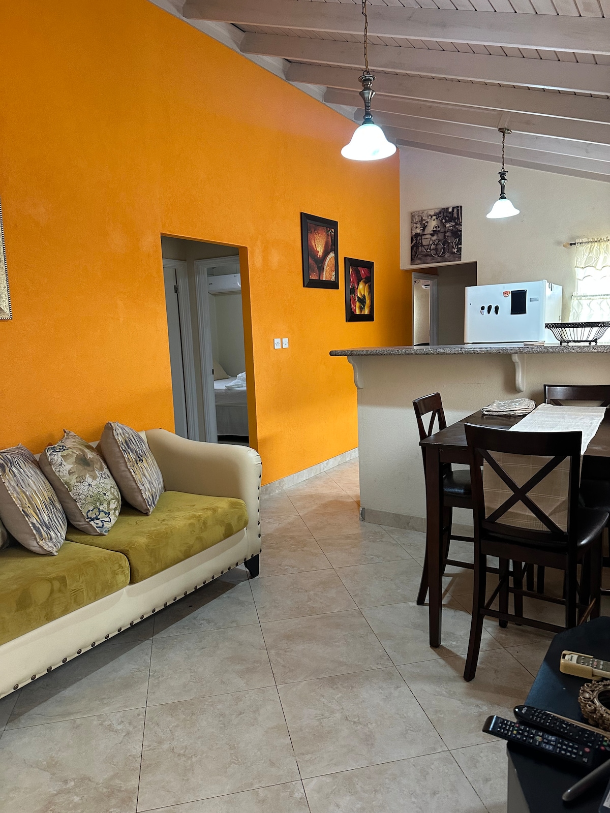 Hyggelig studioenhed på The Lookout, Parishland. Har et privat badeværelse, arbejdsstation, to-personers sofa, aircondition/ventilator, mikrobølgeovn, lille køleskab, kogeplade og redskaber. Ren, sikker og stille med personale på stedet og adgang til vaskeri. Kun 5 minutter fra lufthavnen og mindre end 10 minutter til Oistins, butikker og smukke sydkyststrande – ideel til arbejde eller afslapning.