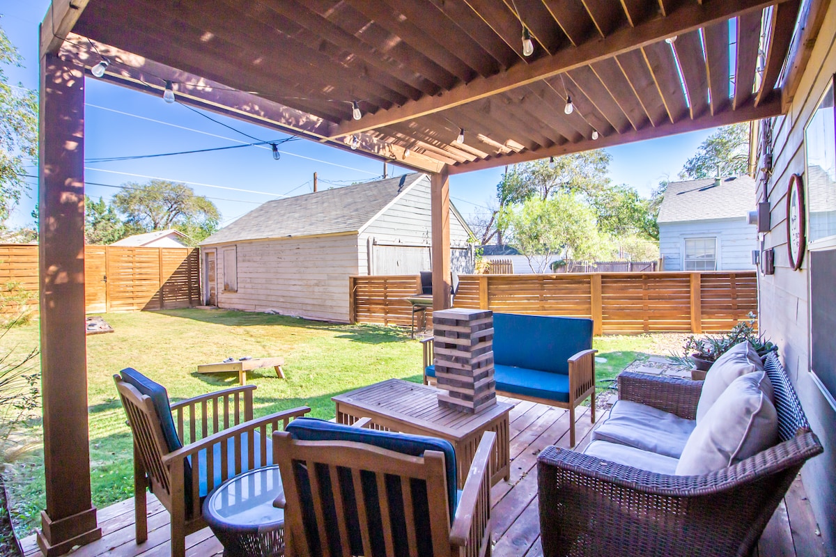Kom og bo i den mest ønskede Airbnb-bolig i Lubbock! Velkommen til The Peggy Sue, en charmerende 3BR/2BA 1930'er Tudor-hytte kun en blok fra, hvor Buddy Holly & Peggy Sue gik i gymnasiet. Kun 4 blokke fra Texas Tech! Har et rummeligt køkken, apparater i rustfrit stål, hyggelige opholdsrum og komfortable senge. Nyd baghaven med kæmpe Jenga og cornhole, eller gå til Broadway og Depot natteliv. Den første Airbnb-bolig med fuldt hus i Lubbock – tag et sjovt billede med vores Buddy Holly-briller.