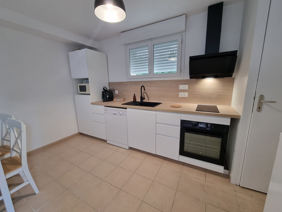 Située à 850m du centre de la ville, a 1.4km (15 minutes à pied) de la gare. Petite maisonnette rénovée en 2021. En été, Vous apprécierez la petite terrasse avec sa plancha ainsi que la climatisation. Le logement est composé d'une pièce de vie avec une cuisine équipée (machine à café Nespresso, bouilloire, plaques vitro, four, micro-onde, frigo+congélateur, vaisselle...), TV et WIFI, ainsi qu'une grande chambre avec son lit queen-size. un WC indépendant et une TRÈS PETITE salle d'eau.