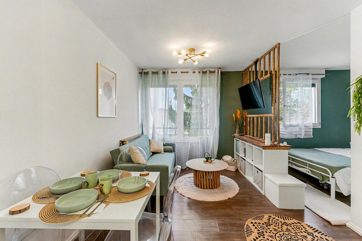 Nice T2 på 27 m2 mindre end 5 minutter fra Toulouse metro i bil. Tæt på supermarked, busstoppested ved foden af boligen, Calicéo, klinik, ringvej 2 minutter væk. Du finder også et træ og en sø med en sportsbane 2 km væk til afslappende øjeblikke. Fuldt udstyret lejlighed: service og køkkengrej, husholdningsprodukter, sengetøj og badesæt. Smart-tv med Netflix, Canal+, Disney+ og Amazon Premium-video. Indtjekning uden vært: Indgangsinstruktioner sendes til D-dagen