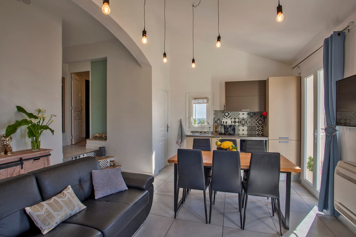 Fantastisk lys moderne lejlighed med smuk udsigt over havet og bjergene. Lejligheden er blevet fuldstændig renoveret i 2020 og er en duplex med soveværelset på første sal, hvilket giver optimal komfort for en lejlighed. Beliggende kun 10 minutters gang fra det historiske centrum af Ile-Rousse og dens hovedstrand, vil du stadig være i ro under dit ophold.