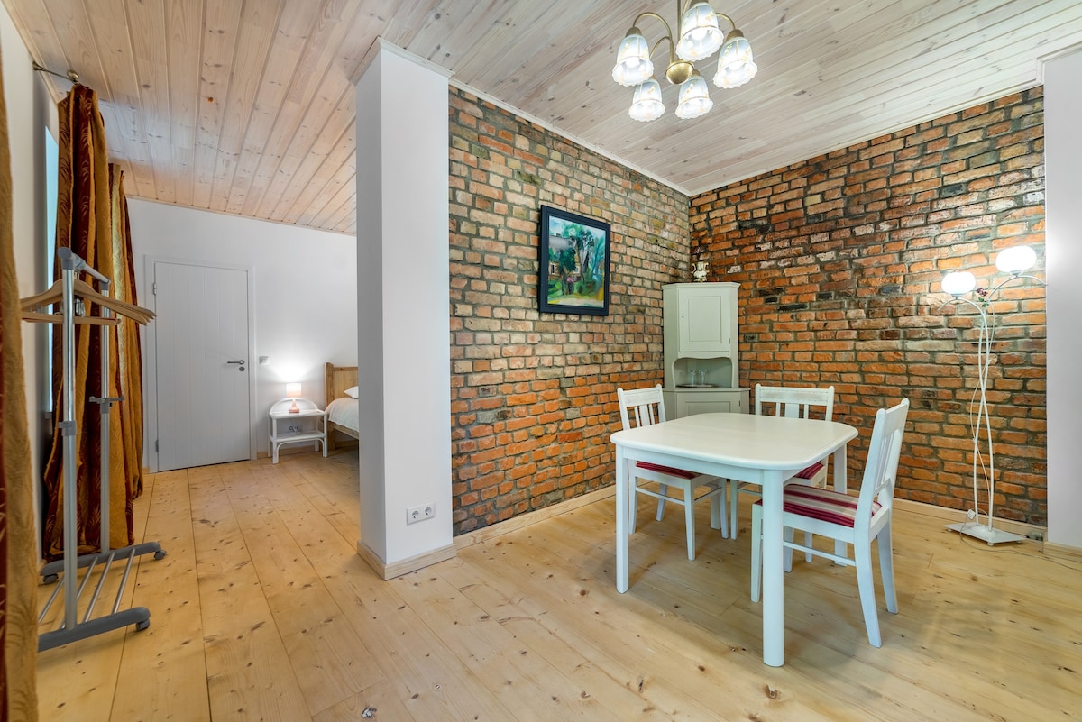 Hyggelig lejlighed/studio, for en forretningsmand eller et par med et barn, lejligheden er udstyret med alt, hvad der er nødvendigt for tre personers afslapning og komfort. Al den nødvendige infrastruktur er inden for gåafstand.