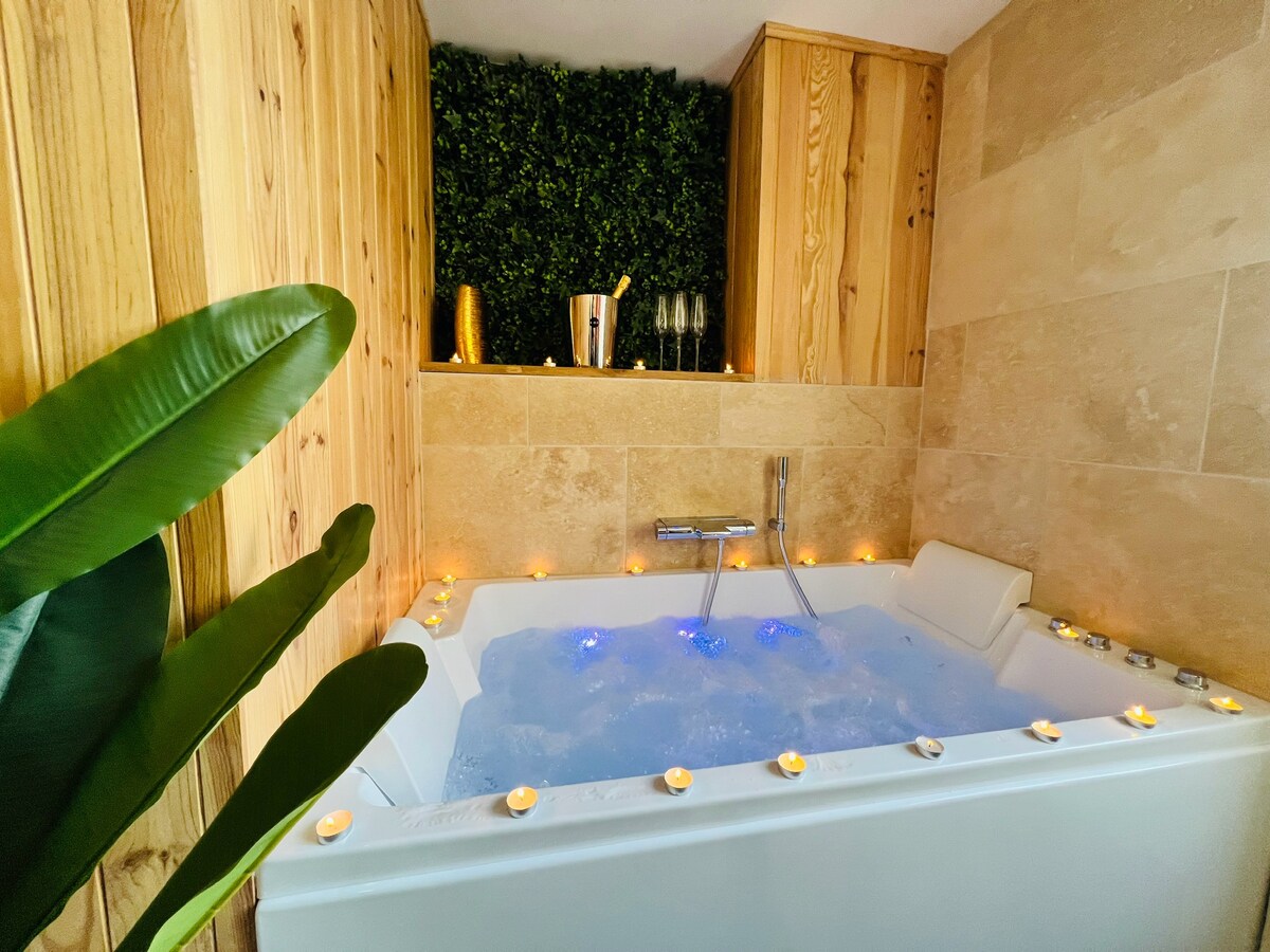 🌿 En afslappende kokon til alle dine ophold 🌿 ℹ️ Spaområdet 🫧 er helt indendørs og kan bruges i al slags vejr. Indretningen (grønt loft, hængende planter, syntetisk græs) genskaber en udendørs atmosfære, mens man holder sig varm og beskyttet. 🏠 Tilstødende bolig: soveværelse, stue, køkken, badeværelse. Babyphone, sengetøj, badekåber, tøfler og rengøring er inkluderet. Opslag ikke PMR