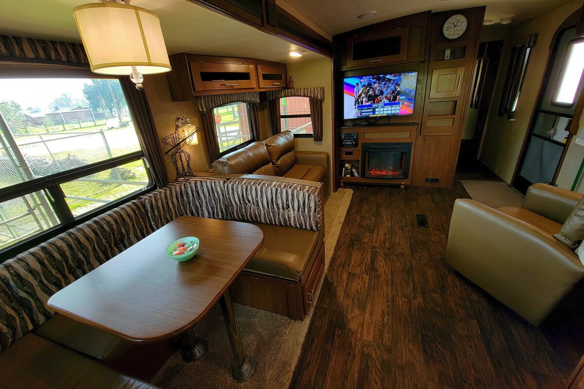 Fifth wheel RV .;) Til at begynde med har vi katte, der vil hilse på dig. De elsker opmærksomhed. Dette Airbnb er ikke et godt match, hvis du ikke ELSKER KATTE. Har en kingsize-dobbeltseng og en sovesofa. køkkenet har alt det væsentlige, og badeværelset er til rådighed. Stuen har en elektrisk pejs. Der er tv i både stue, soveværelse og udenfor med bålpind Bullfrogens SPABAD er fantastisk. I foråret byder vi vores nye ænder , kyllinger og smågrise velkommen.