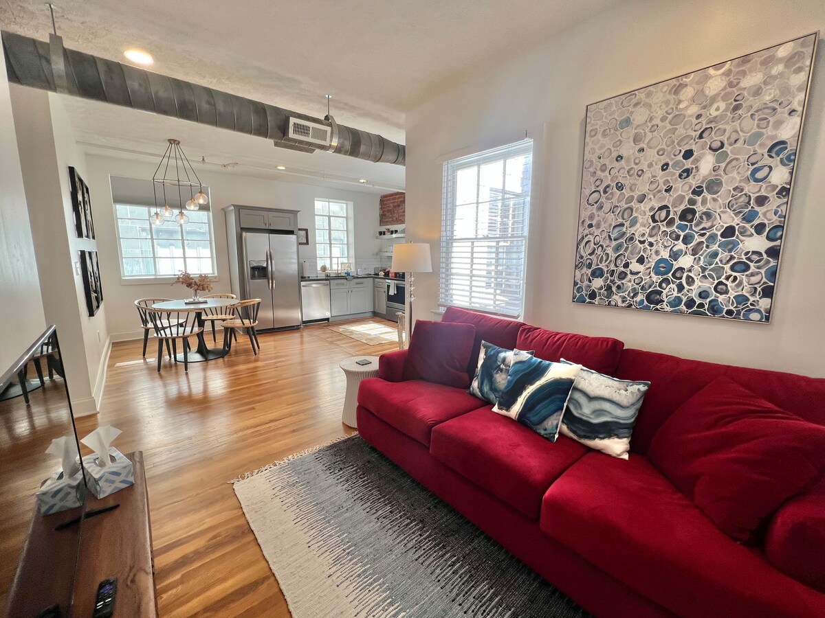 You’ll love staying in this bright open airy loft with mid-century modern decor in the heart of Downtown Lynchburg, Va. This loft is huge, but is currently only set up for two guests. There is a separate bedroom with a king size bed, closet, and sitting area As this loft is above a few other lofts, we ask that guests do not have extra people over, as it bothers the tenants and guests underneath this loft, and that they remove shoes in the loft Accessible only by one set of stairs