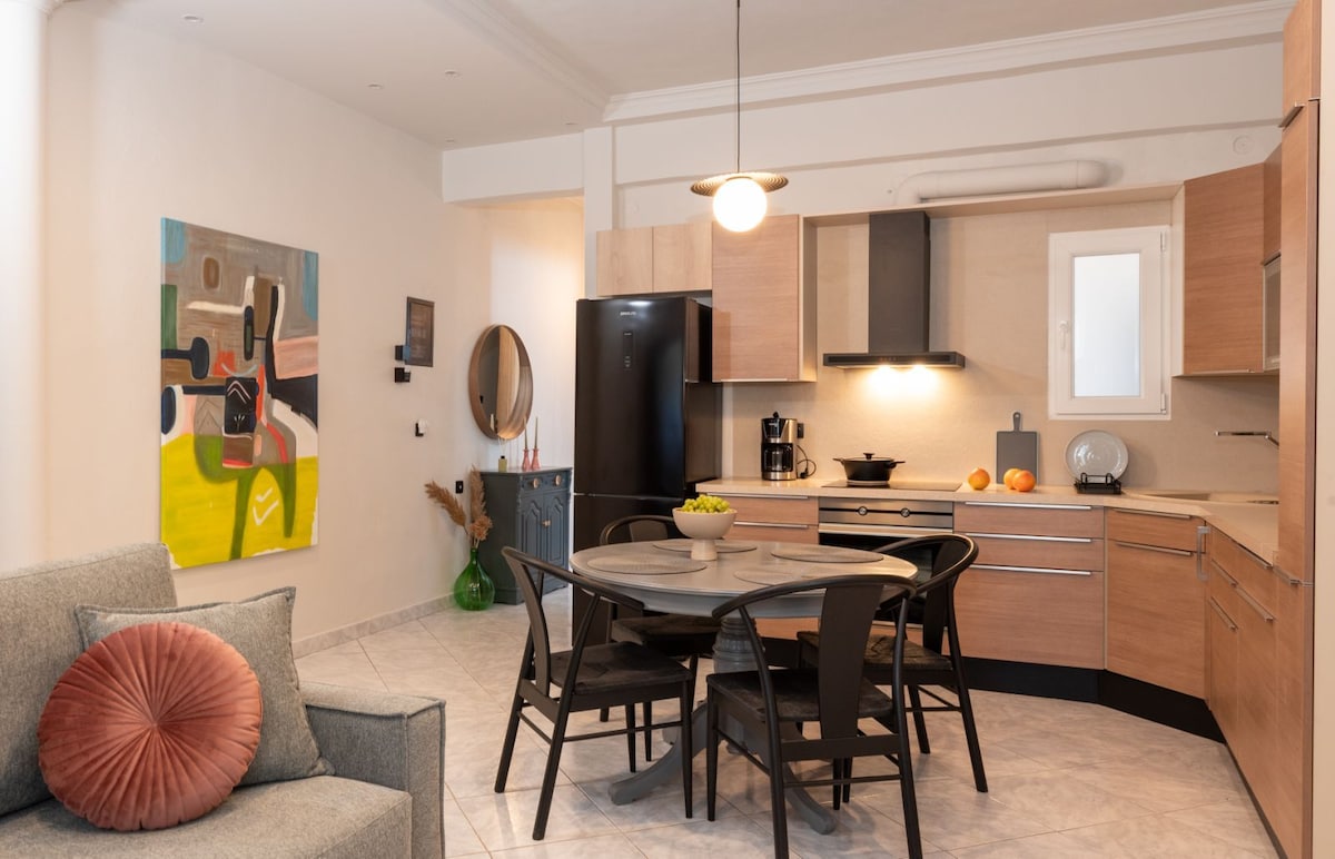 Komplet renoveret lejlighed på 50 kvm, 1. sal, meget tæt på Volos centrum (kun 7 minutters gang) Den har gratis privat parkeringsplads, selvstændig varme, aircondition, vaskemaskine. Den består af 1 soveværelse med 1 dobbeltseng og 50'' tv, stue med sovesofa og 42'' smart tv, badeværelse, køkken og kontor. Lys og varm, velegnet til at have det godt under dit ophold i Volos. Det er ideelt til familier med børn, par, venner og forretningsfolk.