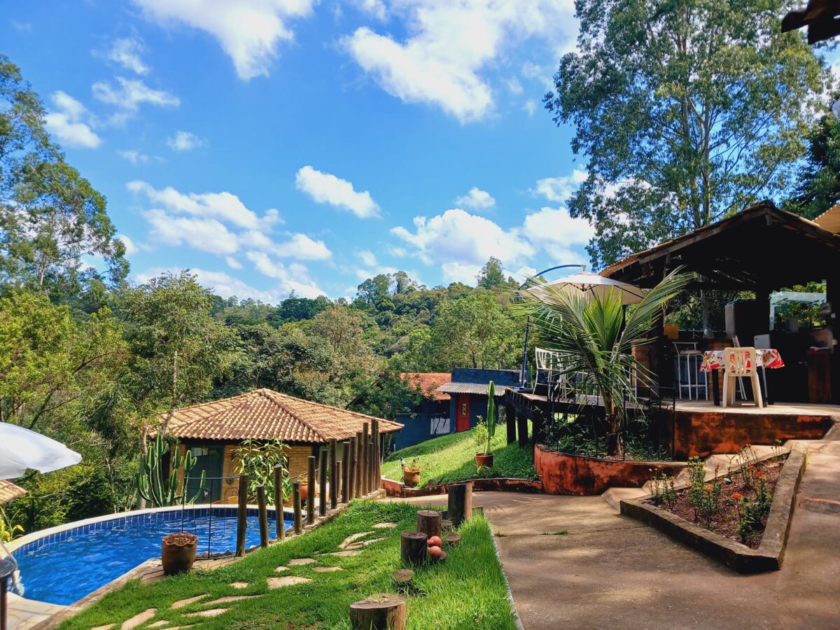 Chalé Manacá er et lille hjørne, hvor du kan nyde en pool og en grill med familie og venner! Det er bygget af en container, og rummet er super stilfuldt og meget fotogenisk, og det har en fantastisk udsigt over landskabet, da det er placeret på toppen af grunden Her kan du slappe af i omgivelser, der er omgivet af natur og lejlighedsvise dyr, såsom aber og egern ... Beliggende tæt på motorvejen (1,5 km)