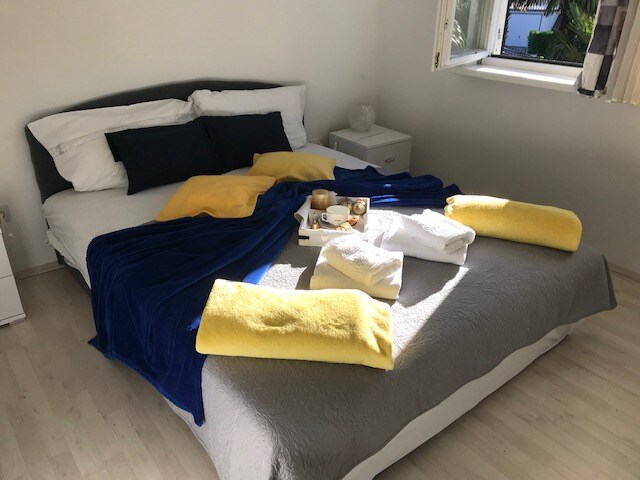 Das Appartement liegt knappe 700 m - oder etwa 10 Geh-Minuten - vom Strand und dem Zentrum entfernt. Es befindet sich im ersten Stock und hat einen separaten Eingang. Die Unterkunft liegt in einer ruhigen Lage, ist modern eingerichtet (TV, Sat, Klima, WLAN, Kaffemaschine, Parkplatz auf dem Grundstück oder in der Garage) und mit 4-Sternen kategorisiert.