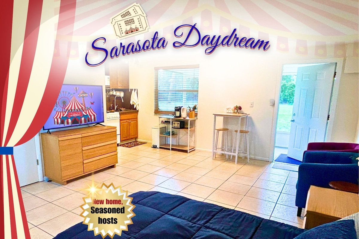 En blok fra Sarasota Bay - fuldstændig ombygget og fuldt møbleret gæstelejlighed med en Miami deco følelse. Enheden er lidt over 300 kvadratmeter med fuldt køkken, et badeværelse med bruser, komfortabel queensize-seng, flere taburetter/stole, fladskærms-tv, wi-fi, parkering uden for gaden, seks USB-porte for nem opladning og siddeområde udendørs på verandaen. Fem minutter til centrum eller SRQ lufthavn, 15 minutter til Lido Beach, og 25 minutter til Siesta Beach med nem adgang til University Parkway eller Fruitville Rd.
