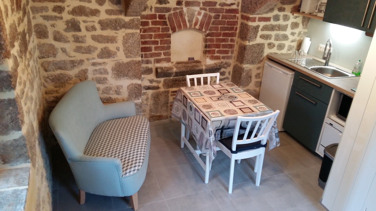 Lille hus med ideel beliggenhed i bugten mellem Mt St -Michel (37 km) og Cancale, en lille malerisk bretonisk havn (12 km), 15 minutter fra St Malo (smuk befæstet by med udsigt over havet), 20 minutter fra Dinard (smuk badeby) og 30 minutter fra Dinan (charmerende middelalderby). Bageri 150 m, lille supermarked og togstation i landsbyen. Smukke strande 12 km væk. Cykelstier i området. 3 km væk kan du nå stranden, hvor du kan gå ture, fiske eller svømme ved højvande!