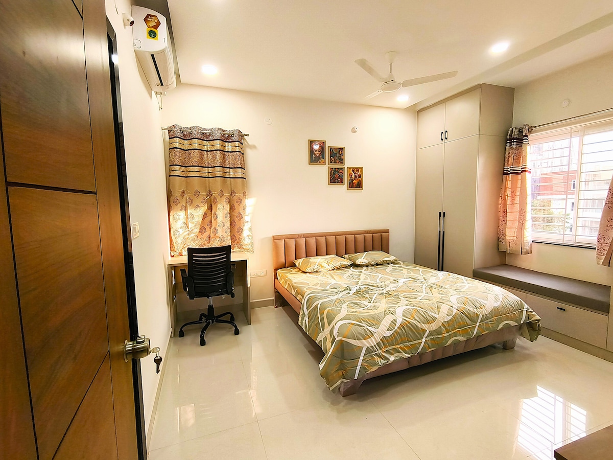 Welcome to Serene HomeStudio! We have a cosy and well-maintained space available for you in a quiet residential neighbourhood. This is ideal for a couple and small family looking for a comfortable place to stay. The room is furnished with a cosy bed, workspace, sitting area, kitchen, washroom and trendy decor. Utilities include water, electricity, security, high-speed Wi-Fi, car parking, AC, TV, etc Serene Homestay is located near shopping centres, restaurants, Hi-Tech City and historic places.