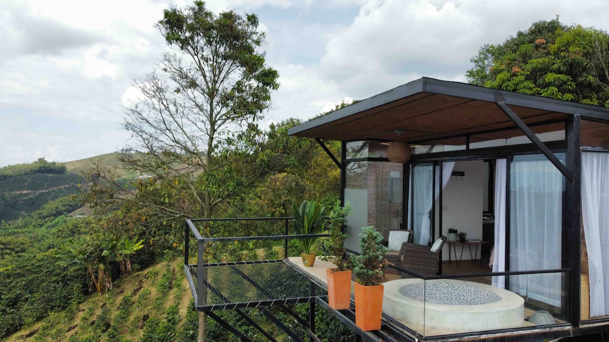 En glampingbolig beliggende i Palæstina, Caldas på en kaffefarm med den bedste uovertrufne udsigt over kaffekulturlandskabet. Hytten har store glasvinduer strategisk indrettet for at sætte pris på de mest imponerende landskaber og solnedgange. Indkvarteringen har en opvarmet jacuzzi, katamarannet, udstyret køkken og et spektakulært gennemsigtigt badeværelse for at sætte pris på den bedste udsigt, mens du er i brusebad med varmt vand. Du vil ikke fortryde det!