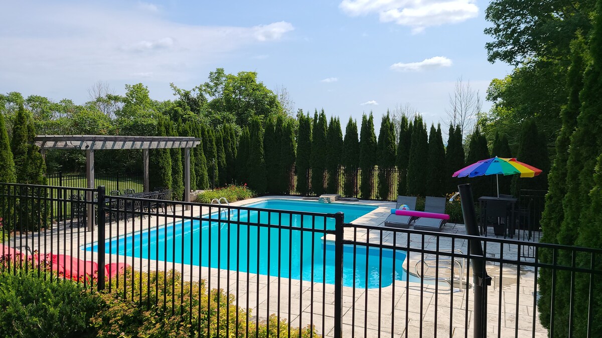 Velkommen til Fairview Hills Farm. Slap af på den rummelige overdækkede veranda i The Squire's Cottage, og se hestene græsse på bakkesiden. En kort gåtur til bagsiden af ejendommen har naturlige vådområder med en overflod af forskellige fuglearter. Bruce Trail ligger tæt på med parkering. Har du ikke lyst til at lave mad? Der er et udvalg af restauranter, eksklusive takeaway-restauranter i nærheden, eller du kan lave mad i det fuldt udstyrede køkken. Om aftenen kan du hygge dig med en god bog foran pejsen.