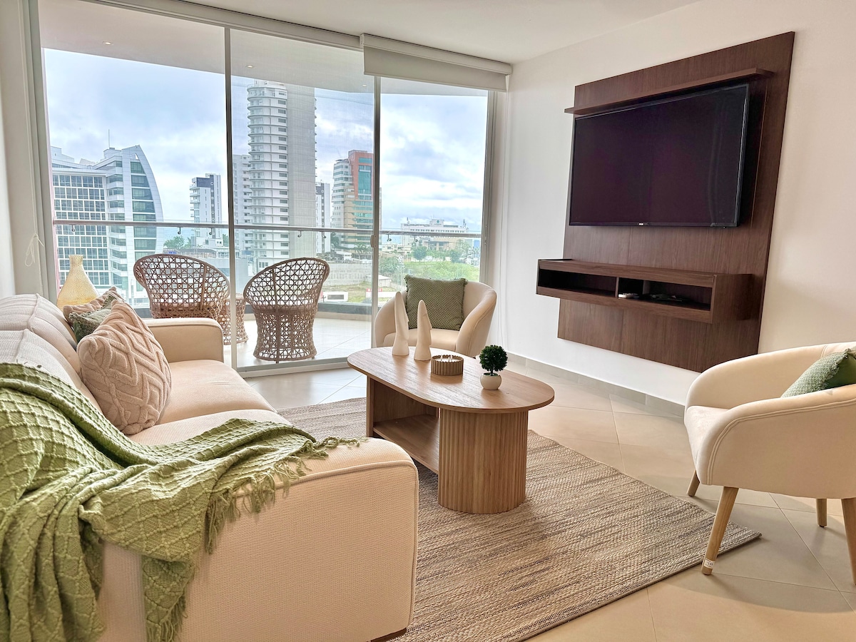 Moderne lejlighed i Edificio Mónaco i det eksklusive Barbasquillo-område, byens bedste hotel- og gastronomiske område. Nyd 3 komfortable soveværelser, pool, fitnesscenter, parkering og nærhed til stranden (kun 5 minutter væk!). God til familier eller forretningsrejser. Den har internet af høj kvalitet og 2-i-1 vaskemaskine og tørretumbler. Vi har en privat vagt med en vogter 24/7. Denne smukke bolig er ikke kæledyrsvenlig.