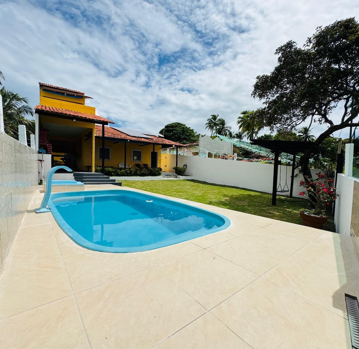 Esta acomodação elegante é perfeita para viagens em grupo, maravilhoso para famílias grandes e confraternizações. uma área externa com piscina e cascata, e iluminação para período noturno. A casa possui rampas na entrada e saída para acesso de cadeirantes, e possui rampa de acesso na área externa da piscina também. A acomodação possui churrasqueira na área da piscina e banheiro externo .