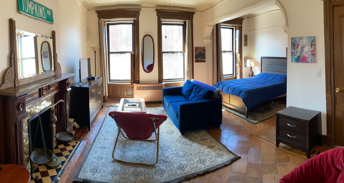 Denne smukke Brownstone-lejlighed ligger i hjertet af Bedford Stuyvesant, med mange aktiviteter og restauranter at vælge imellem. To blokke væk fra bar- og lounges himmel. ☺️ Der er bogstaveligt talt ikke noget bedre sted at være i Brooklyn. Dette rum er meget rummeligt, med opdaterede apparater og møbler, med en bekvem butik direkte på hjørnet af blokken, 5 minutters gang til togstation og busstoppested. Værten vil være tilgængelig for eventuelle problemer/spørgsmål, du måtte have under dit ophold.