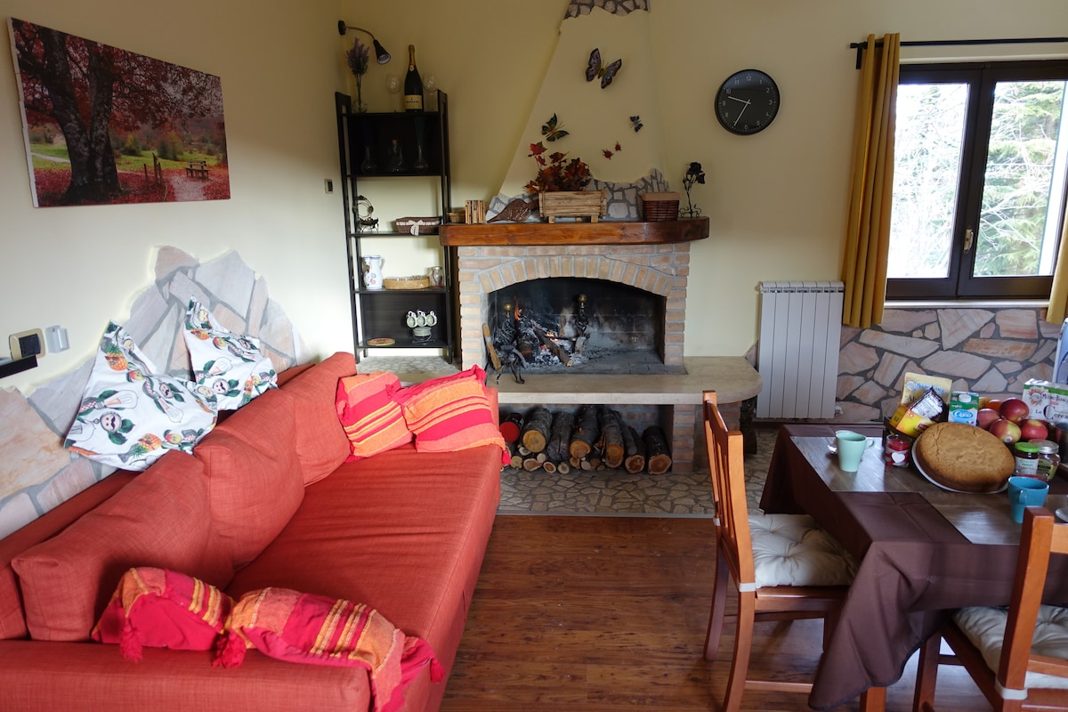 sten og træ hus omgivet af grønne områder Huset ligger omkring 40 km fra Pescara et par meter fra den middelalderlige landsby Corvara på omkring 750 m højde Det er beliggende i centrum af en skov på omkring 25000 kvadratmeter fuldt anvendelig Stedet er meget stille, gaden er privat med port Derhjemmefra er der flere stier, der tillader afslappende gåture Fra corvara kan du nemt nå rocca calascio,30km Stefano di sessanio,28km Sulmona,25km Lavaparken 30 km