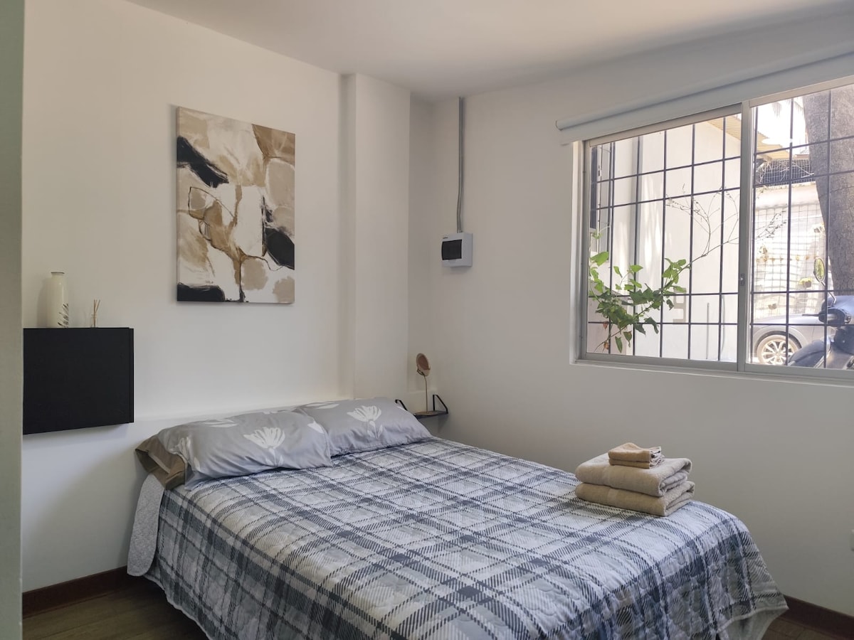 Ny, moderne og lys lejlighed i Quitos sikreste kvarter. Ved siden af Parque La Carolina og i gåafstand fra den helt nye Quito-metro. Tæt på restauranter, butikker, indkøbscentre. Faciliteterne omfatter en komfortabel queensize-seng, fuldt udstyret køkken, fiberoptisk wi-fi, vaskemaskine og tørretumbler, 65" Samsung 4K-tv, fitnesscenter, grillplads på taget. Perfekt til par eller forretningsrejsende.