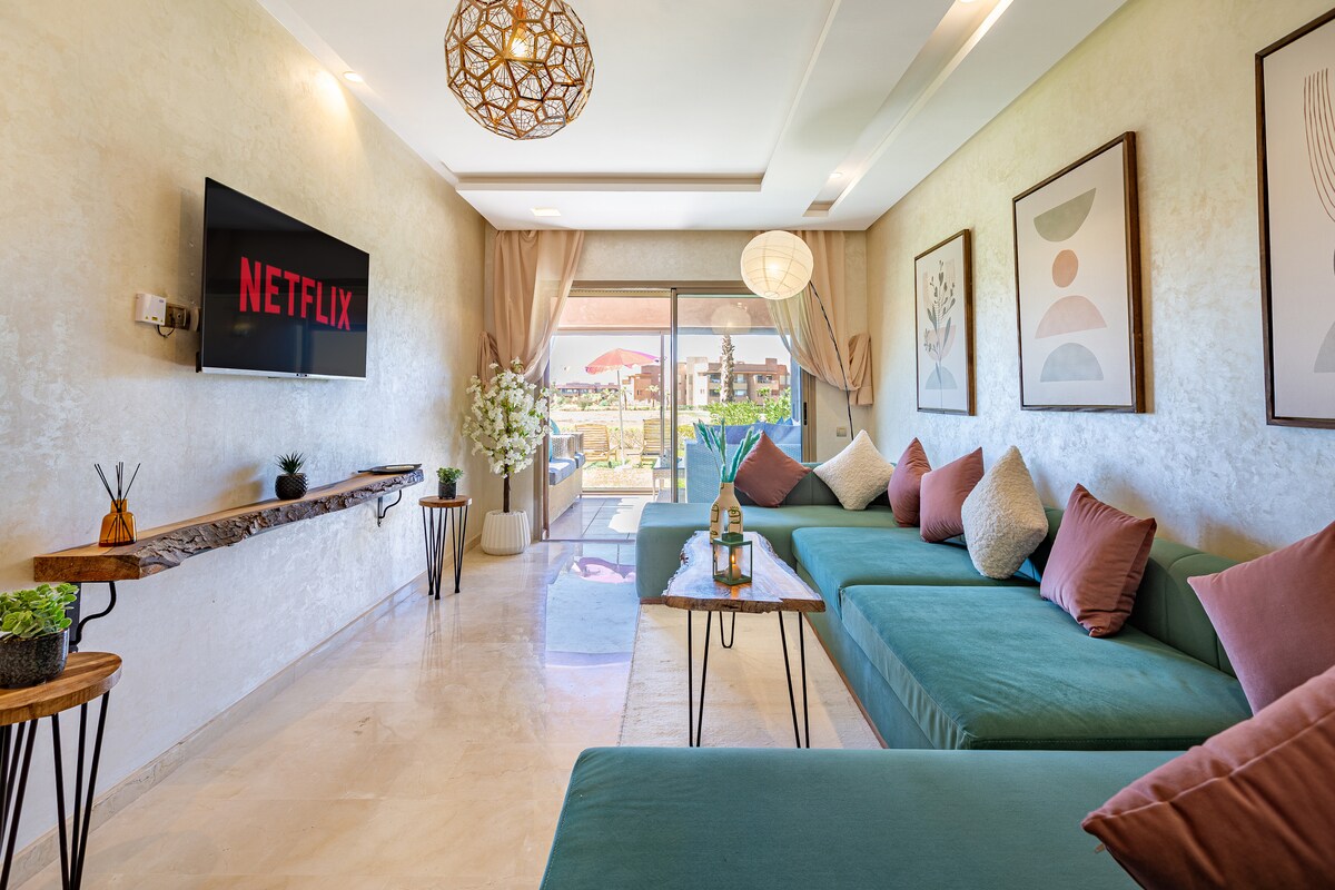 Détendez-vous dans ce logement unique et tranquille. A Prestigia Argan Golf Resort, Magnifique Appartement dans une résidence sécurisée : - Salon avec Canapé convertible, - Chambre lit double avec Tv connectée, - Deux terrasses vue piscine, - Fibre Optique 200 Mbps, idéale pour le streaming et le télétravail, - TV Smart avec IPTV et Netflix, - Cuisine équipée, - Piscine - Jardin, - Parking la piscine est ouverte à partir du mois Juin jusqu’au décembre.