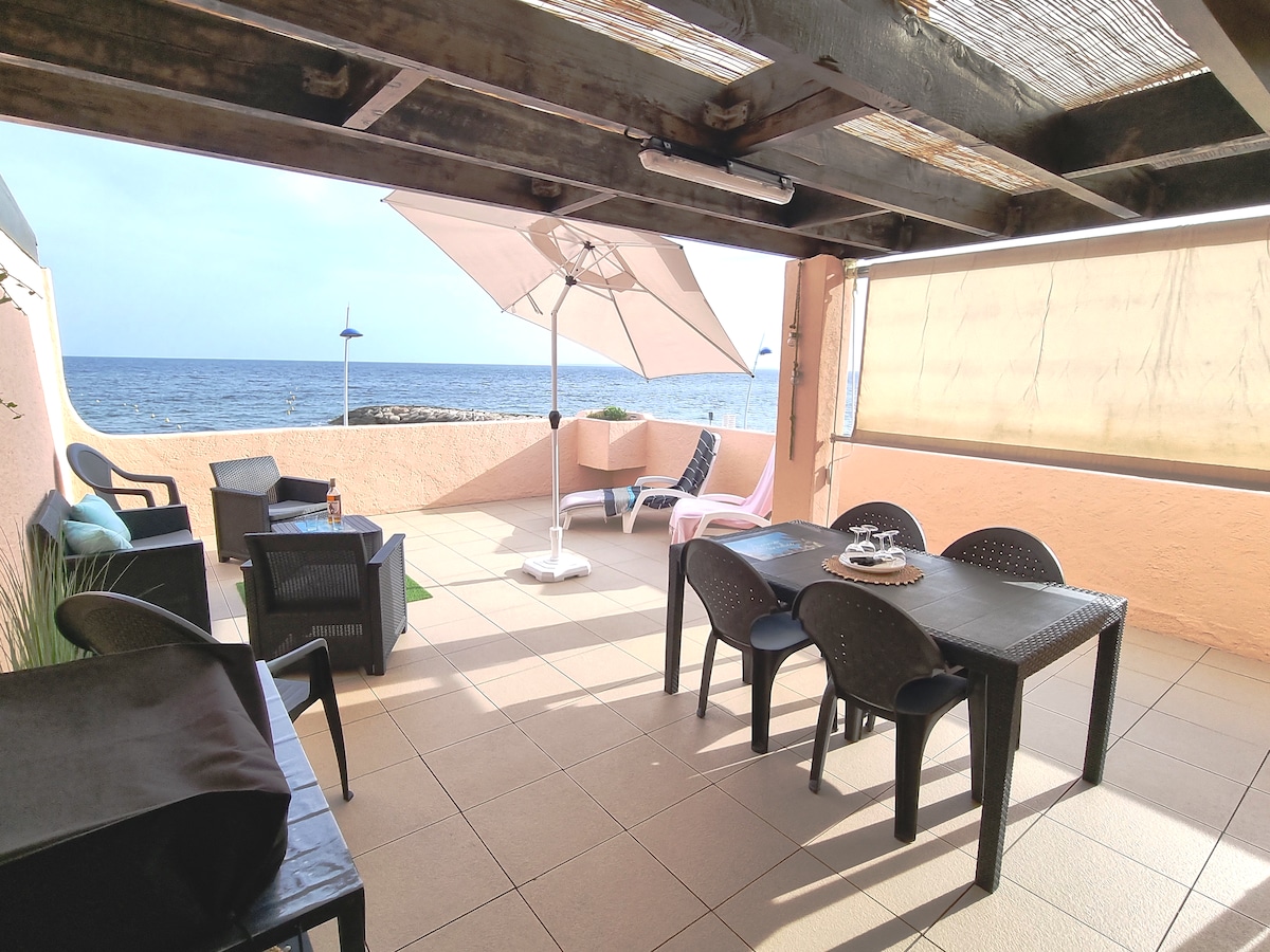 Smuk lejlighed med en betagende udsigt over havet. På 1. sal i en bolig med parkeringsplads og vagt. En indgang ved havet, en ved byen, automatisk port. Station mindre end 5 minutters gang, havnen 2 skridt væk. Søndagsmarked. Fantastisk kystvej for atleter og vandrere. Terrasse på 36 m2, fuldt udstyret med plancha. 2 soveværelser, et med 160 × 200 seng ovenpå med opbevaring, den anden seng 140 × 190 Badeværelse med stor bruser og toilet - Møbleret køkken