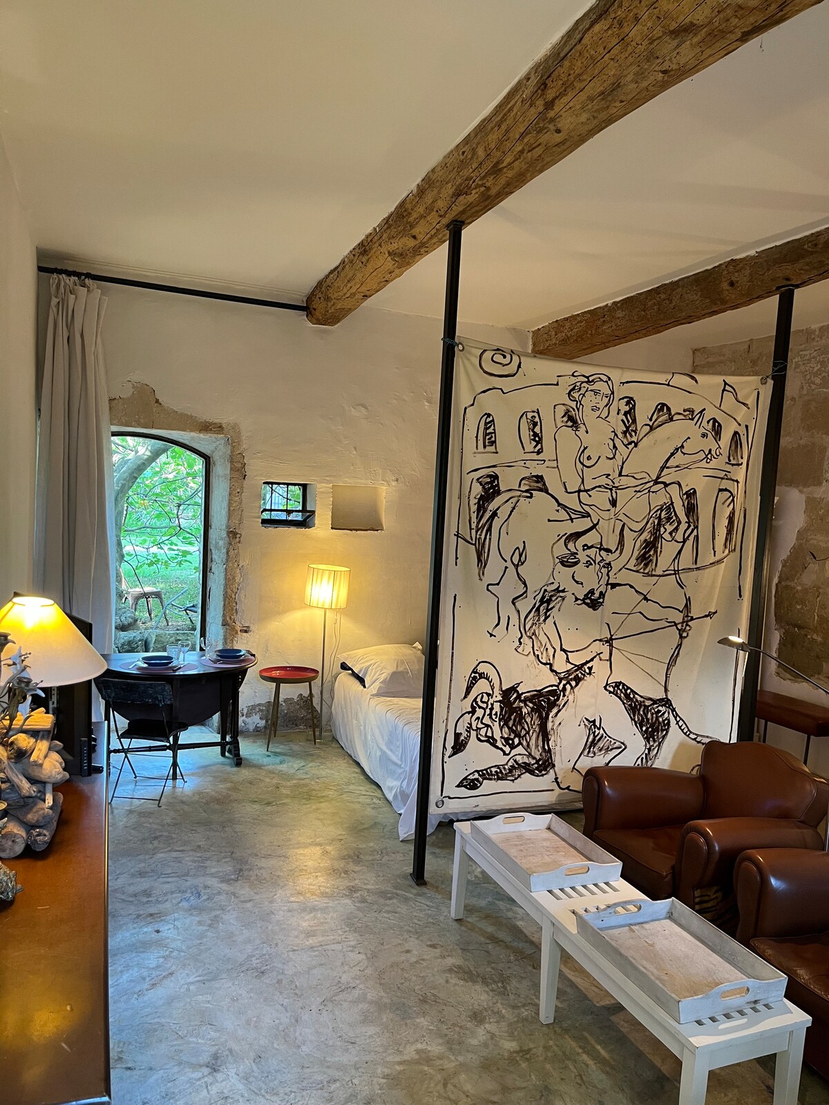 Vores lejlighed ligger i en bygning fra det 16. århundrede, tæt på Place du Forum, og er beliggende på 3. sal uden elevator. Den er designet til et par eller en enkeltperson, der ønsker at besøge byen. Med en terrasse, der vender ud mod tårnene i Saint Trophime, hvor du kan spise morgenmad og solbade. Et stort, lyst, gennemgående og klimatiseret rum, hvor man kan lave mad og slappe af, kommunikerer med et sovejr med et italiensk brusebad. Insta: la_terrasse_du_forum