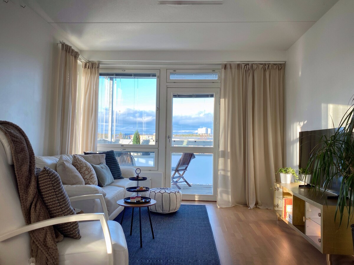Modern air conditioned 43,5 sqm apartment in new tower building next to Matinkylä metro station and Iso Omena shopping mall (2018 shopping mall of the year NCSC). Amazing 16th floor views (14th living floor) from the large fully glazed balcony with seating area. Helsinki city center only a 20 min metro ride away. One bedroom with king size continental bed (180 cm wide) and the living room modular sofa consists of 3 separate 80x200 cm beds with easy opening mechanism.
