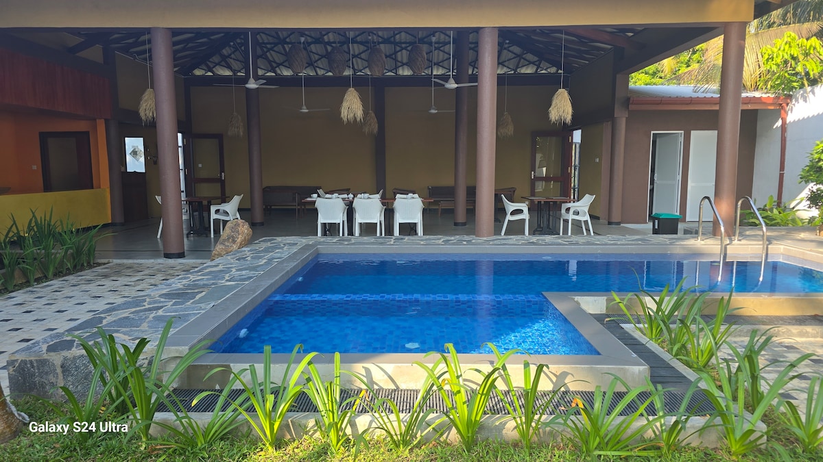 Dragonfly Suite er en romantisk, arkitekttegnet, stort to-etagers luksushus til to, eller et par med en baby eller et lille barn, i den populære landsby Madihe med udsigt over Det Indiske Ocean. Der er intet mellem den tropiske strandhave med privat pool og pooldæk og Sydpolen. Erfarne surfere kan gå gennem strandporten lige ind i de bedste bølger i Madihe.