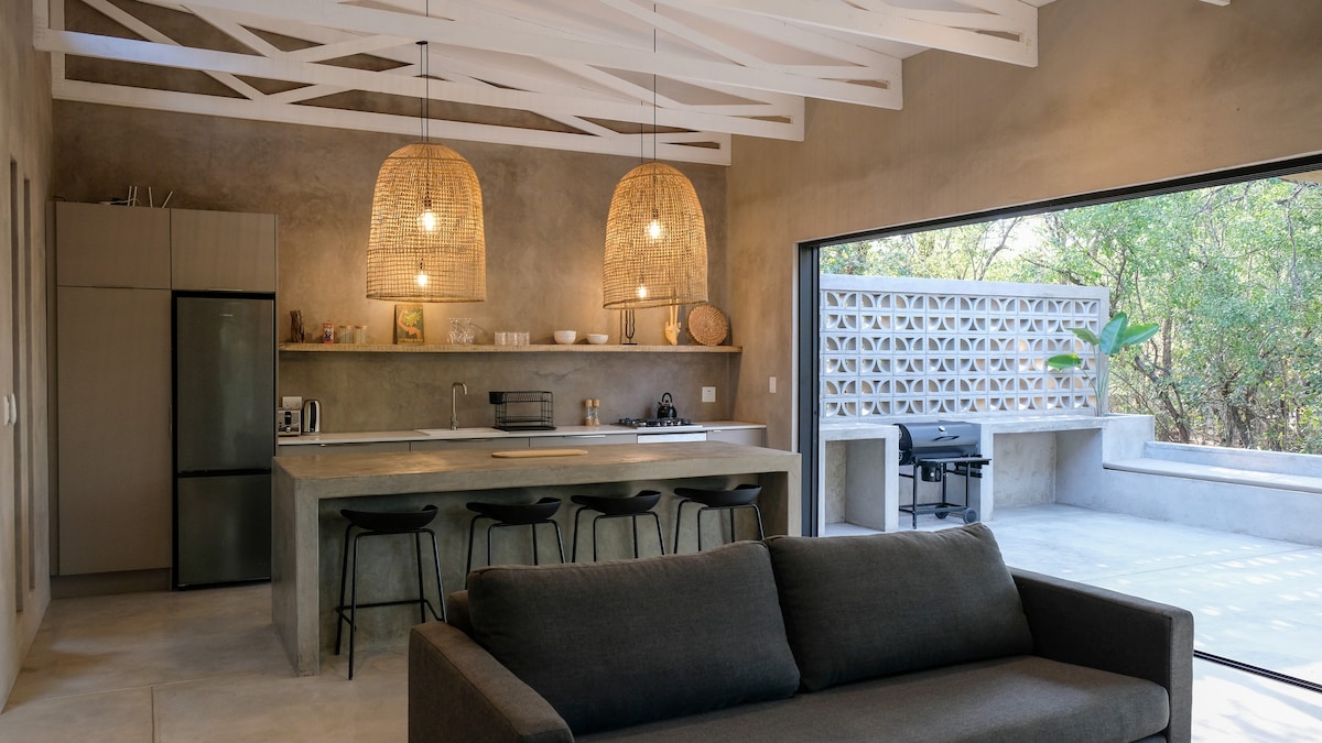 Denne unikke bolig har sin helt egen stil. Et moderne A-hus, der ligger midt i bushen, der grænser op til Kruger National Park i Marloth Park. Denne unikke ejendom lover en unik oplevelse med en blanding af moderne og naturlig skønhed. Huset er badet i naturligt lys takket være dets høje lofter og store vinduer, hvilket skaber en luftig atmosfære. Rene linjer og lyse interiører definerer det moderne design, der giver et behageligt og stilfuldt fristed.