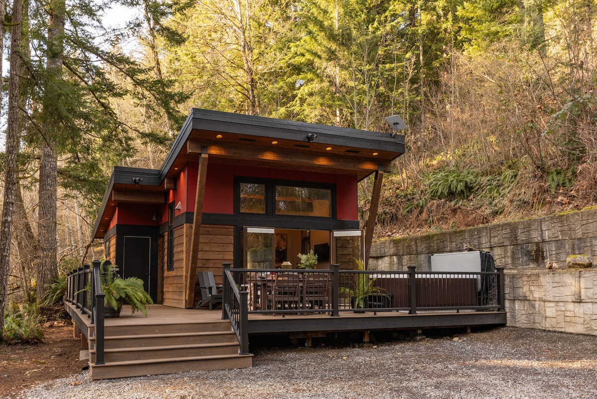 Privat. Fredeligt. Romantisk. Designet til uforglemmelige udflugter. Undslip din egen afsondrede spahytte kun få minutter fra Mount Rainier NP. Efter en dag med eventyr kan du vende tilbage til dit private spabad, specialbyggede cedertræssauna og bålsted under skovens krone. Gennemtænkte detaljer, hyggelig belysning, et fuldt udstyret køkken, kaffebar, spil og streaming gør det nemt at falde til og blive et stykke tid. Mange gæster vender tilbage år efter år til jubilæer, fødselsdage og rolige afslapninger!