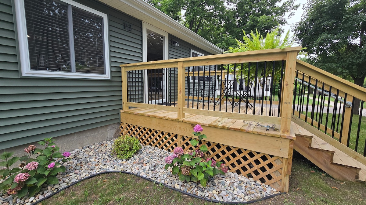 Tag på udflugt til vores charmerende hytte ved Muskegon River. Perfekt til eventyr eller afslapning. Nyd kajakroning, fiskeri, tubing og en rummelig græsplæne og terrasse med udendørs højttalere. Saml jer omkring bålet eller grillen på den store terrasse. Udforsk White Pine Trail i nærheden, hvor du kan cykle og vandre. Kun 15 minutter fra restauranter og butikker i Big Rapids. Hyggeligt soveværelse med en seng i fuld størrelse plus køjesenge. Slap af på terrassen med fredfyldt udsigt over floden og masser af dyreliv. Book din drømmeferie nu.