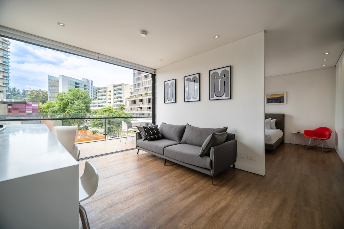 Experience Medellín in this stylish and exclusive open-plan studio near Parque Lleras with private jacuzzi, A/C, king-sized bed, 54" rotating smart TV, Netflix, workspace with high-speed Wi-Fi, fully equipped kitchen, washer/dryer, tea/coffee station, and black-out curtains. Enjoy amazing city views, superb interior design and finishes, gym, sauna, swimming pool, and on-site bars, restaurants, cafeteria, and art gallery — the ultimate exclusive retreat for comfort, style, and vibrant nightlife.