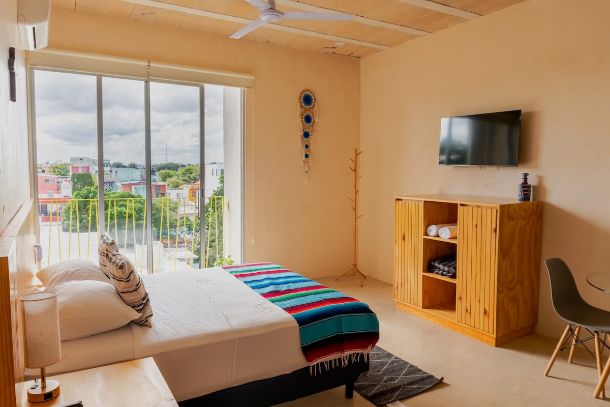 Oplev Cancún fra denne komfortable hybel i hjertet af byen. 100 meter fra ADO-busterminalen og R1-bussen, der tager dig direkte til strandene. Omgivet af lokal kultur såsom Palapas Park, Market 23 og 28. Stille, sikkert område med alt i nærheden: restauranter, supermarkeder og butikker. Ideel til rejsende, der leder efter komfort, beliggenhed og autenticitet i deres oplevelse. Hvis du kan lide at lære det lokale liv at kende og gå, er dette din perfekte base i Cancun!
