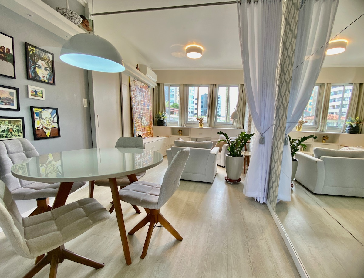 Leder du efter et hyggeligt checkpoint i hjertet af byen? Du vil føle dig hjemme på dette velplanlagte loft. Beliggende i centrum af Florianopolis, er det perfekt til nogen, der ønsker at udforske øen eller deltage i et arrangement i nærheden. Inkluderer: - queensize-seng - Komplet gourmetkøkken - Vaskemaskine og tørretumbler - Stort bord til måltider og hjemmekontor - 360 Rotations-tv, så du kan se fra hvor som helst på loftet - Rent og moderne badeværelse - Wi-fi - Komplet aircondition